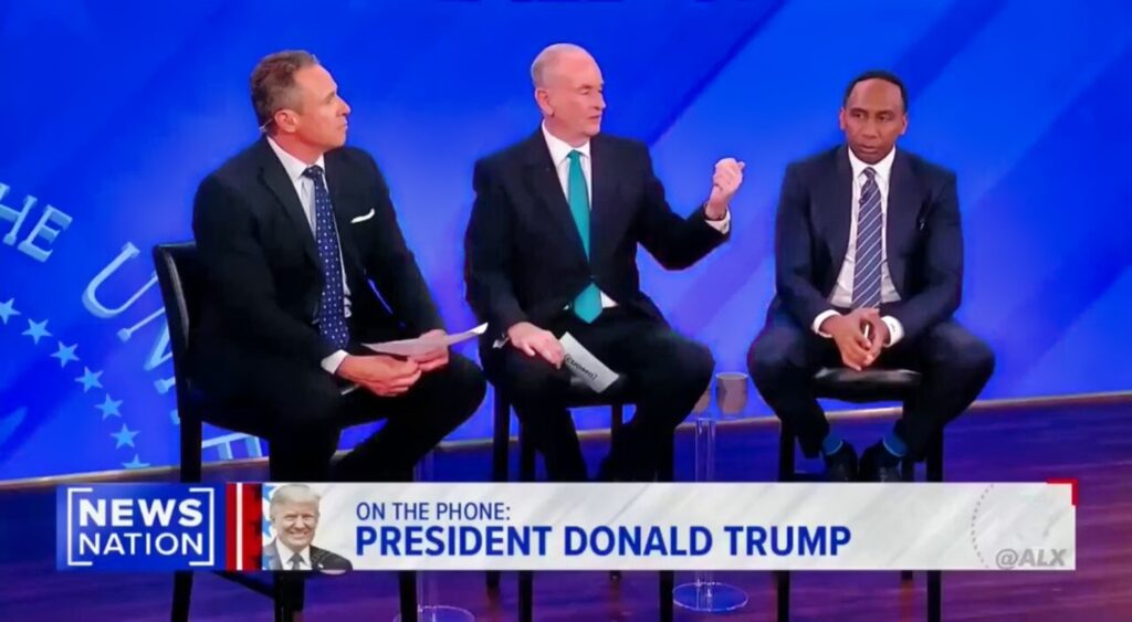 Stephen A. Smith participated in a NewsNation town hall with former CNN anchor Chris Cuomo and conservative political Bill O’Reilly, previously with Fox News. President Trump was on the phone and endorsed the idea of Smith running for office in 2028.