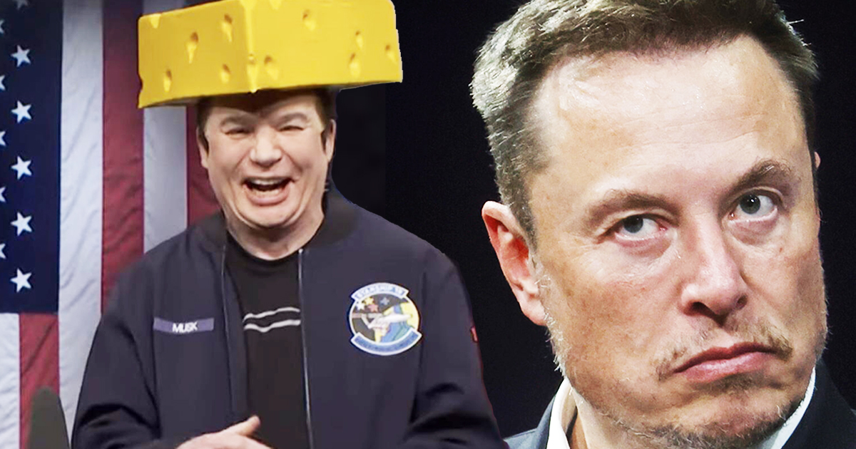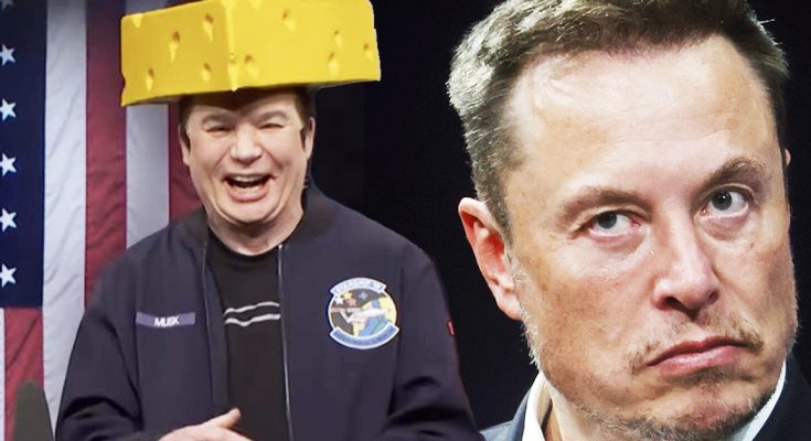 In a surprise twist during the “Trump Tariff Cold Open,” Mike Myers made a guest appearance as Elon Musk, mocking the billionaire with a sketch centered around a bizarre new Tesla invention: a self-vandalizing car. Myers, donning a cheesehead hat in a nod to Musk’s real-life appearance at a failed Wisconsin political rally, quipped, “That was from when I tried to buy the election in Wisconsin. I’m an idiot. I should have just bought Wisconsin!”