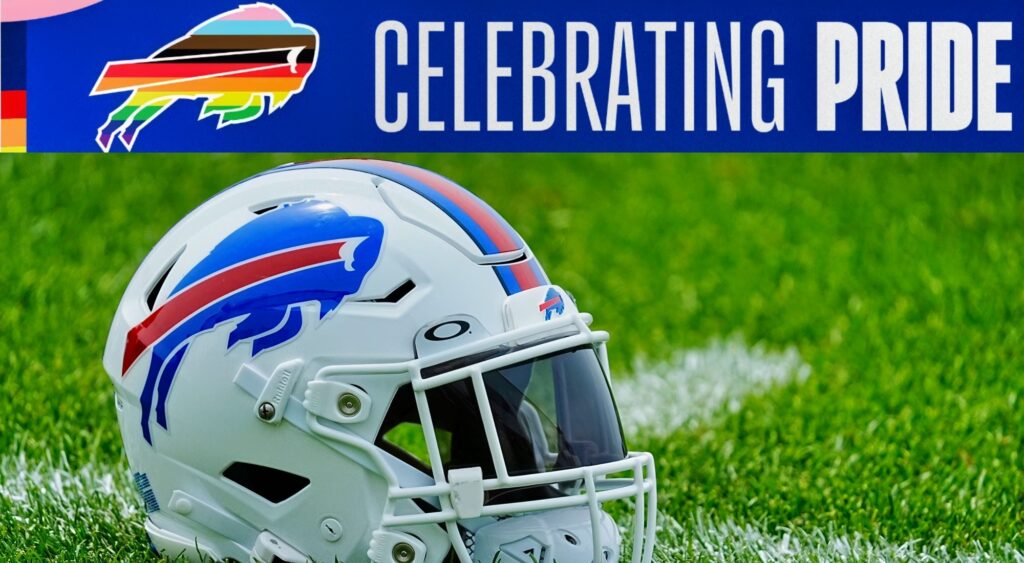 Buffalo Bills Pride signage and helmet (Photos via buffalobills.com & Imagn Images)