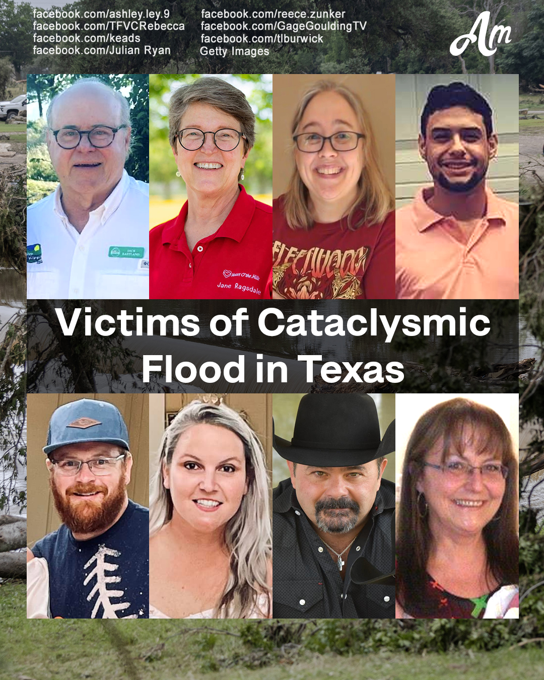 Confirmed among the deceased are Camp Mystic director Dick Eastland, Camp Heart Oā the Hills director Jane Ragsdale, Katheryn Eads, Julian Ryan, soccer coach Reece Zunker and his wife Paula, Jeff Wilson, and Tanya Burwick.