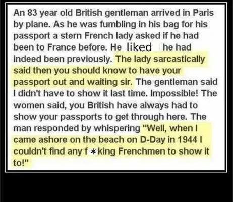 An 83 year old british gentleman arrived in Paris by plane. As he was fumbling in his bag for his passport a stern French lady asked if he had been to France before. He liked he had indeed been previously.