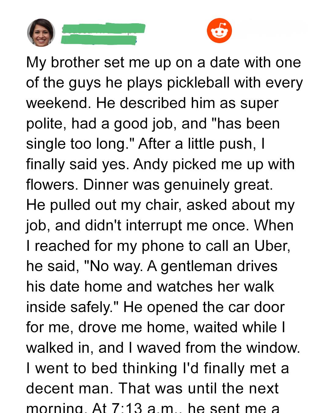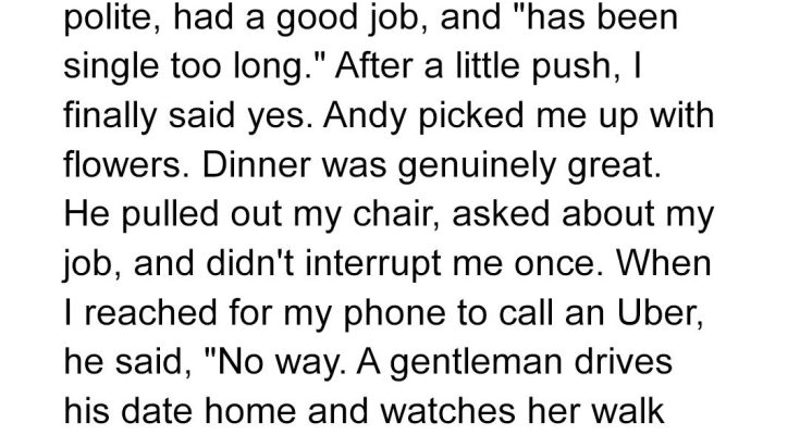 When my brother insisted I go on a date with his friend Andy, I finally gave in. To my surprise, Andy was charming, polite, and thoughtful — even bringing flowers and opening doors. Dinner went smoothly, and when he offered to drive me home, I hesitated but agreed, breaking my usual “no rides on first dates” rule. The evening felt refreshingly genuine, and for the first time in a while, I let my guard down.