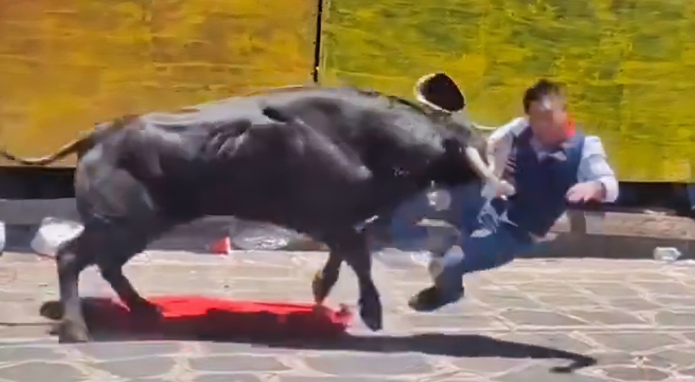 The guy then puts his muleta on the ground and gets on his knees to further provoke the cattle. This is a big mistake.