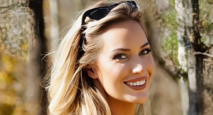 In the picture, the golf influencer is seen wearing denim shorts and a low-cut black top that shows off some cleavage. She is also wearing black leather boots and has her hair down.