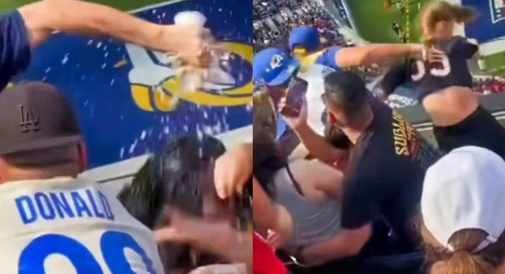 A violent altercation was captured on video between fans during the Rams’ win over the Texans on Sunday, which left a woman bloodied.