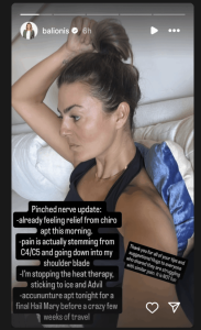 “Pinched nerve update: Already feeling relief from (chiropractor) appointment this morning,” she wrote on Instagram. “I’m stopping the heat therapy. Sticking to ice and Advil. Acupuncture appointment tonight for a final Hail Mary before a crazy few weeks of travel.”