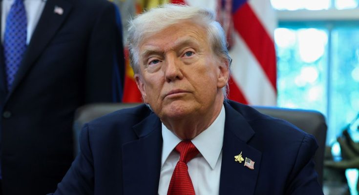 Donald Trump holds the World Cup Trophy in the Oval Office August 22, 2025 in Washington, DC. | Source: Getty Images